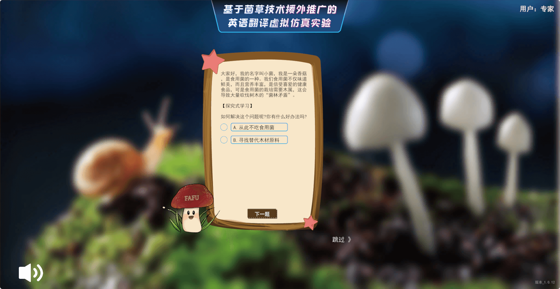 通过具有农林特色的FAFU小菌启发式提问,带领学习者进入虚拟仿真情境,并引导学习者思考菌草技术的作用。